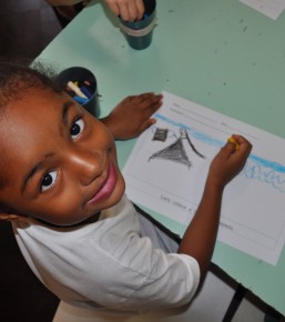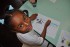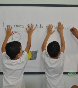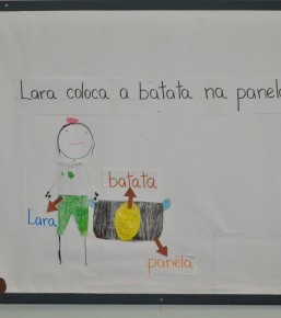 Após o teatro e algumas brincadeiras, os alunos fizeram desenhos sobre a frase. Lançada a frase, os próximos passos são “brincar” com as palavras-chave para que as utilizem em diferentes contextos (frases). Depois, então, partem para a análise auditiva e visual de cada “pedacinho” (sílaba) que as compõem para a formação de novas palavras e frases. Do todo para as partes, das partes para o todo.